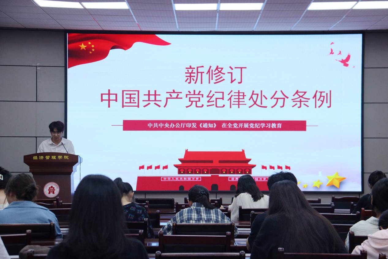 为深入开展党纪学习教育,进一步引导广大党员学纪、知纪、明纪、守纪,“金种子”宣讲团于6月18日在经世楼开展党纪学习教育宣讲活动,与100余名学生党员一起深入学习《中国共产党纪律处分条例》,领悟党纪实质,把握党纪要义。