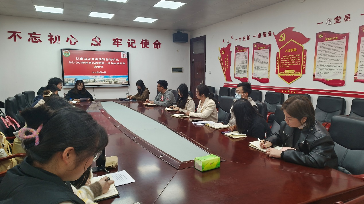 2024年3月13日经济管理学院2023-2024学年第二学期第一次学生组织联席会议在经世楼204召开。团委、学生会、学生管理与发展中心及研究生分会负责人和学院团委学工办老师曹欢、罗婷婷、李子琳、王建平、兰仙平、马超、出席会议。