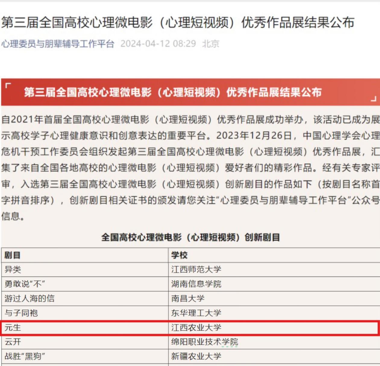 近日,中国心理学会心理危机干预工作委员会组织发起第三届全国高校心里微电影(心理短视频)优秀作品展。由我院罗婷婷老师指导,周丹、柯云杰等同学参演的心理微电影作品《元生》,在经过学校和专家层层打磨后,从来自全国各地200多个作品中脱颖而出,荣获第三届全国高校心理微电影(心理短视频)创新剧目优秀作品。这已是我院第二次在心理情景剧类大赛中获得的国家级荣誉。