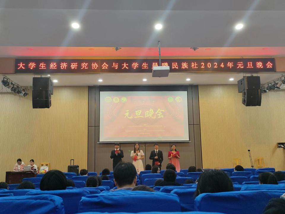 “龙岁迎盛世,莺啼好春光......”,2023年12月29日晚,大学生经济研究协会与大学生晨曦民族社在东区E教207教室联合举行以“‘心’连‘新’,新筑梦,梦飞Young”为主题的2024年元旦文艺晚会。大学生经济研究协会指导老师梁志民教授、廖冰副教授应邀出席。校社团管理委员会、经协、晨曦民族社等兄弟社团共150余人共同观看。