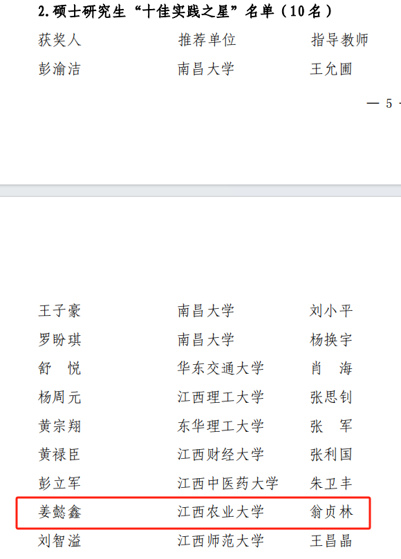据悉,江西省研究生“十佳学术之星”“十佳实践之星”评选活动,是江西省教育厅根据《关于加快新时代江西省研究生教育改革发展的实施意见》精神,为进一步繁荣研究生学术文化、增强广大研究生的创新意识和创业能力、营造积极向上的学术创新氛围、充分发挥优秀研究生示范引领作用而创办的。自2021年开始已连续开展三届,逐渐成为展示我省高校研究生优秀典型的重要窗口。2023年,经学生申报,各研究生培养单位推荐,省教育厅组织专家开展初选和复选,评选出博士研究生“十佳学术之星”和“十佳实践之星”各10名、提名奖各5名,硕士研究生“十佳学术之星”11名、提名奖3名,“十佳实践之星”10名、提名奖5名。