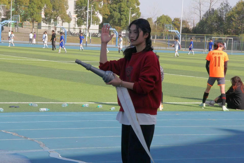 在工作人员完成清场工作并布置模拟好火灾现场后,消防队队员为志愿者们重点讲解了灭火器的分类、使用要点以及注意事项,并实地演示干粉灭火器以及水枪的使用步骤。在认真听讲及观摩后,老师和志愿者们都跃跃欲试。