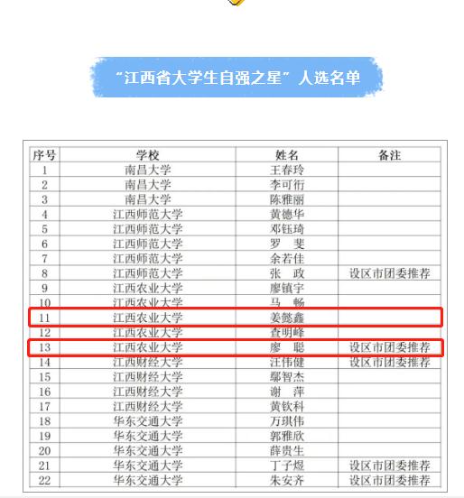 近日,2021年度“江西省大学生自强之星”和江西省推报“中国大学生自强之星”奖学金人选名单揭晓,我院2021级研究生姜懿鑫以及2020级本科生廖聪获评2021年度“江西省大学生自强之星”。