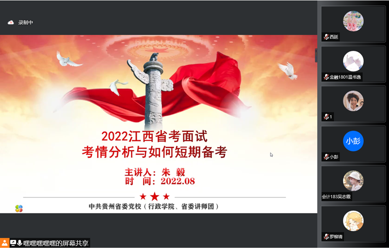 为响应学院党委“我为群众办实事”号召,进一步帮助即将进行考公面试的2022届毕业生了解面试流程和注意事项,提升面试信心,经管学院于8月1日晚采用线上方式举行考公面试经验分享会。本次分享会主讲人是经管学院2021届优秀校友、中共贵州省委党校讲师朱毅,会议由学工办老师余文慧主持。