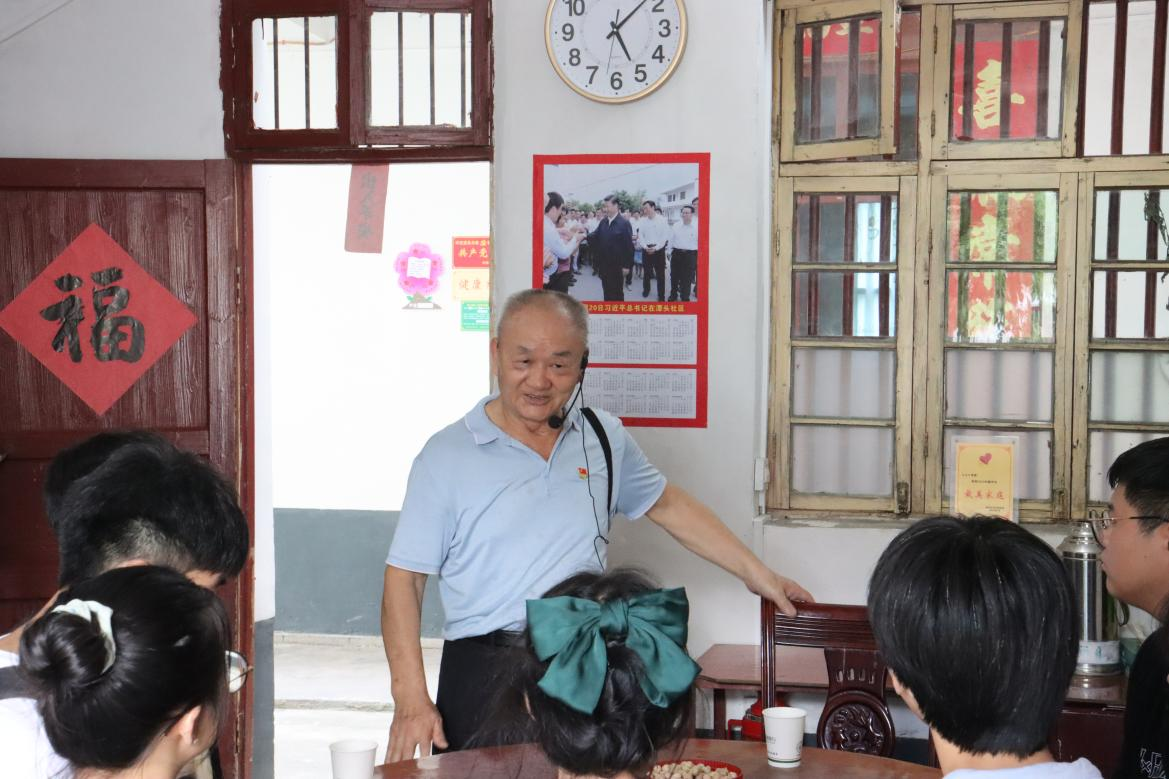 沿着习近平总书记考察路线,实践团队来到了梓山镇潭头村。在村口中心位置一座红旗形状的雕塑上面,豁然写着一行标语——“幸福都是奋斗出来的”,在阳光下格外醒目。红军烈士后代、孙观发爷爷的家就在潭头村的入口处。2019年5月20日,习近平总书记带着对革命老区人民的牵挂,来到这里考察,同当地镇、村干部及孙观发一家围坐在一起拉家常。从那天起,孙观发被乡亲们称为“最幸福的人”,他的家也成为网红打卡地。孙观发还在村里经营起“饮水思源”餐馆和超市,他将自家种的绿色蔬菜和养殖的土鸡、土鸭摆上桌,颇受游客们喜爱。除去用来直接招待游客,潭头村还开设网店,通过网络将绿色蔬菜和土鸡土鸭销往全国各地。2021年,孙观发一家的收入达到近20万元。曾经“梓山潭头,吃苦两头”,现在潭头村已经成为远近闻名的“三产融合”示范村。