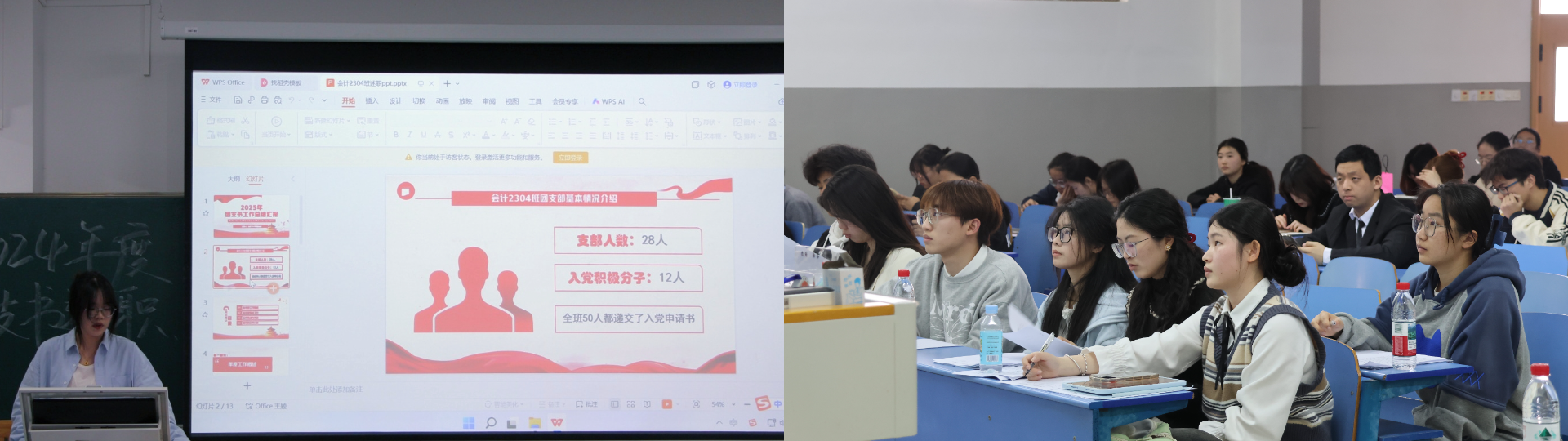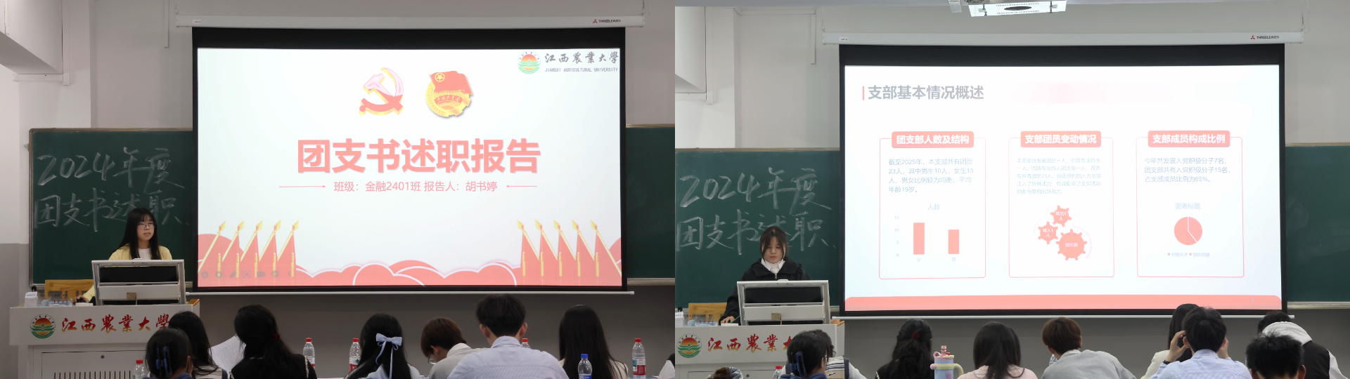 大会述职环节,各团支书依次上台对本年度工作作述职报告,通过PPT展示班级团支部在思想引领、组织建设、志愿服务、文体活动等多个方面的工作亮点。述职结束后,团委委员进行提问评议,针对团支部工作完成度、团员参与度提升等问题与团支书们深入交流,给出精准指导意见。