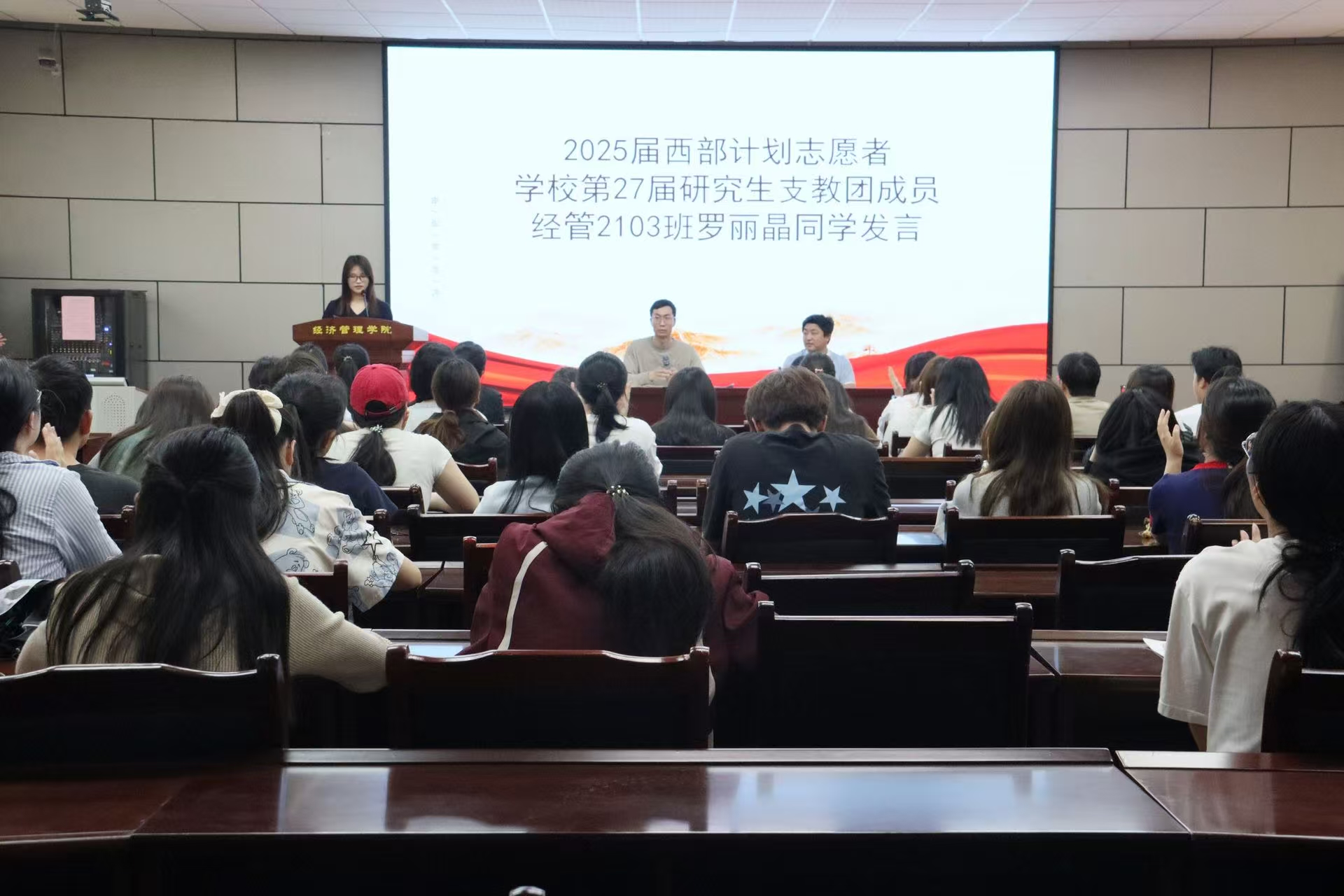 会议伊始,王建平领学了习近平总书记给戍边支教西部计划志愿者服务队队员的回信内容。经管学院团委学生第二副书记经济2202班万智轩、学院学生会主席会计2202班杨雨洁、2024年度“五四红旗”团支部和“优秀共青团干部”代表经管2303班万文汐、2025届西部计划志愿者和学校第27届研究生支教团成员经管2103班罗丽晶、经管学院研究生分会副主席2023级会计专硕谢娟娟五位学生代表,分别结合自身学习体会和工作实际依次上台发言。