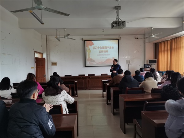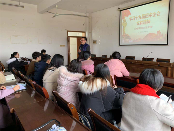 为进一步学习贯彻好党的十九届四中全会精神, 12月19日下午3点,经济管理学院研究生党支部在厚德楼506会议室开展了学习党的十九届四中全会精神专题宣讲会,由分管研究生工作的周波副院长做宣讲。