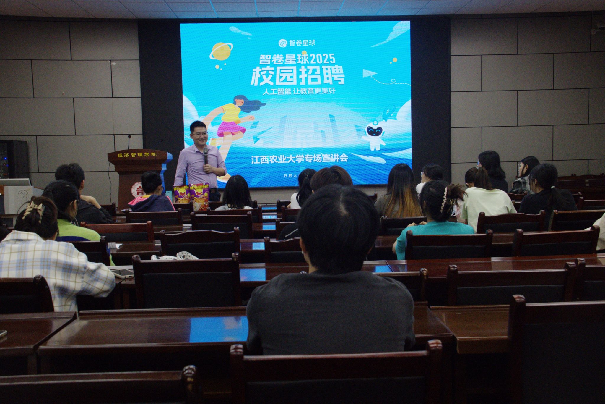 宣讲会伊始,熊经理以一段视频开场,展示了公司的工作日常,向在场毕业生们呈现了公司的良好工作氛围和环境。紧接着,他详细介绍了公司的热招岗位和薪资福利,并强调了公司“人工智能,让教育更美好”的发展理念,使在场毕业生对该公司有了更清晰的认识。最后,毕业生们积极提问,参与互动,熊经理也耐心地解答,赠送大家小礼品,并呼吁大家踊跃报名、参与面试。