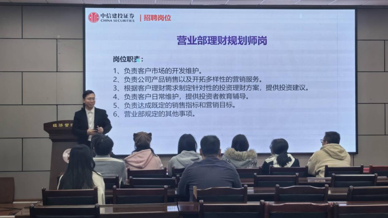11月19日下午14:30,我院于经世楼207室成功组织召开中信建投证券专场宣讲会。本次宣讲会由该公司HR吴先生主讲。