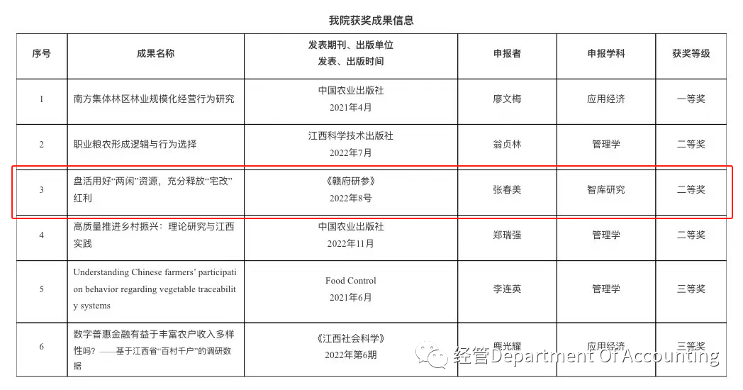 近日,江西省社会科学界联合会公布了第二十次社会科学优秀成果奖获奖名单,我院MPAcc导师张春美教授申报的智库研究成果《盘活用好“两闲”资源,充分释放“宅改”红利》荣获二等奖,该项成果的成员还包括会计系吴文军副教授、农业农村厅四级调研员明经结以及会计学硕士研究生罗泽霖、曹冠乔、胡玲。