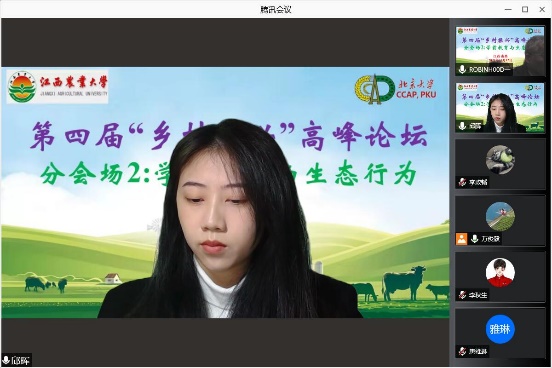 2021年12月12日,由江西农业大学主办,经济管理学院及北京大学新农村发展研究院等联合承办的第四届“乡村振兴”高峰论坛暨“乡村人才振兴与乡村建设行动”学术研讨会圆满召开。12日上午,由我院张征华教授指导的2019级会计硕士研究生邱晖同学参与了论坛“学前教育与生态行为”线上分会场,并作了题为《环境规制政策情境下合作社理事长绿色认知对合作社绿色创业行为的影响研究》的报告。
