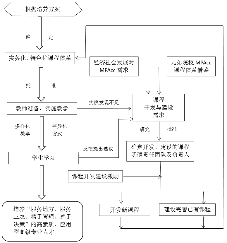 围绕MPAcc人才培养目标,着眼时代发展和专业前沿,综合任课教师教学实践及学生反馈建议,借鉴兄弟院校课程设置,由任课教师或该课程模块团队成员提出开发、建设需求,提交课程模块团队讨论,以项目的形式,报会计硕士专业学位教育工作指导小组研究批复。
