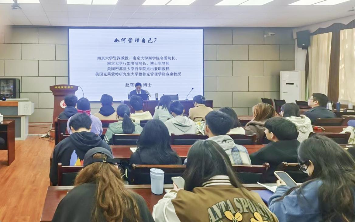 3月20日上午,南京大学行知书院院长、人文社会科学资深教授应邀来我院作题为《如何管理自己》专题学术报告,报告由经济管理学院副院长周波教授主持,学院院长李剑富教授、工商管理系全体教师及部分学生聆听了报告。