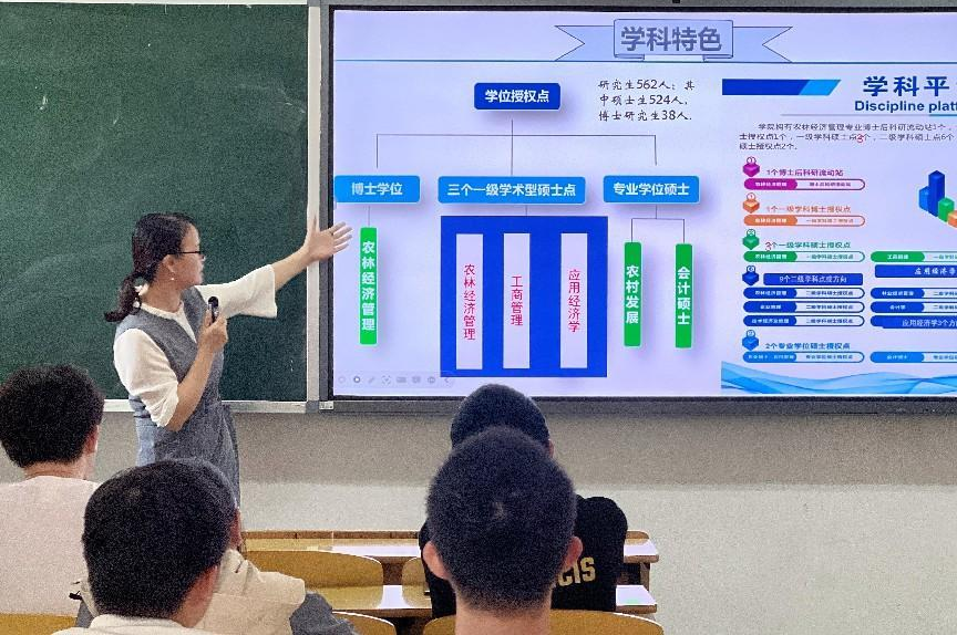 在宣讲过程中,经济管理学院领导班子向各高校介绍了学院发展历程、学科建设特色、师资力量配备、教研平台建设和教育教学成效等情况,重点解读了2024年研究生各项招生政策。期间,还同相关学院领导作了深入交流,并热情接受同学们的报考咨询。