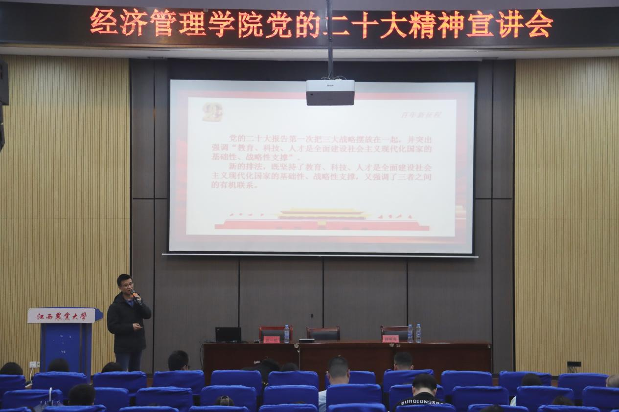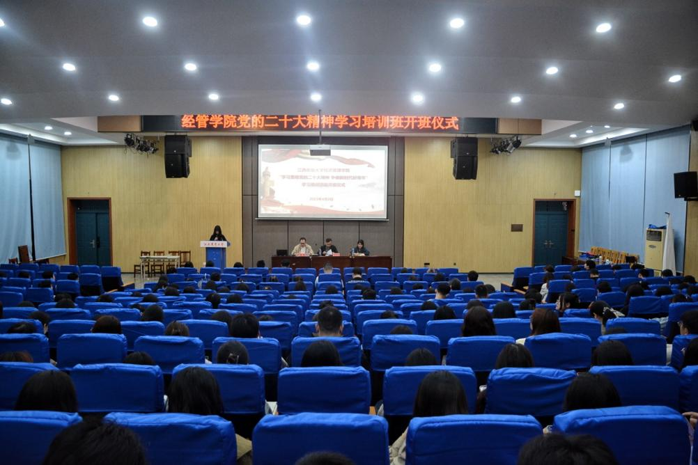 为贯彻落实学校《关于在全校党员中开展党的二十大精神学习培训的通知》文件精神要求,进一步提高学院学生党员的政治素质和理论水平,4月3日晚,经管学院在东区E教207室举办“学习贯彻党的二十大精神 争做新时代好青年”专题培训班开班仪式。院党委书记郭军海、院党委副书记赵刚、各学生党支部书记、全体学生党员共计300余人参加了开班仪式。开班仪式由院党委副书记赵刚主持。开班仪式结束后,校党委委员、宣传部部长贺一松受邀以《学习贯彻党的二十大精神,促进教育高质量发展》为题,向大家作了首场报告。