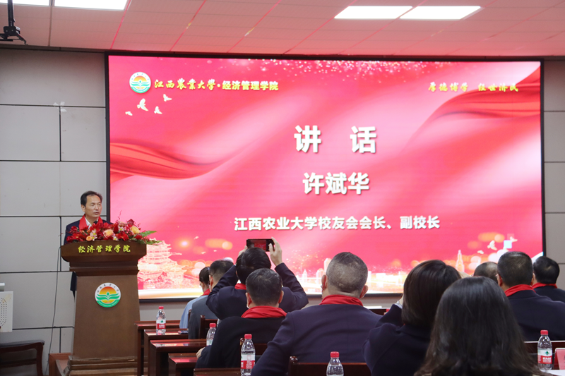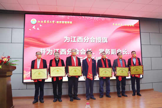 在授旗环节,副校长、校友会会长许斌华为经济管理学院校友会江西分会授旗,当选会长翁贞林代表江西分会接旗。