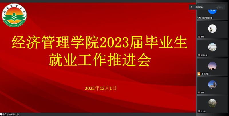 12月1日晚,经管学院于线上腾讯会议召开2023届毕业生就业工作推进会,深入学习贯彻党的二十大精神,落实2023届全国普通高校毕业生就业创业工作网络视频会议精神,总结历史经验、分析就业形势,全面部署推进2023届毕业生就业工作。学院领导班子成员、2023届毕业班班主任、学工办辅导员参加了会议,会议由院党委副书记赵刚主持。