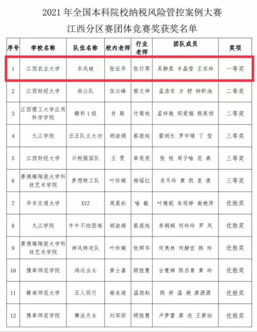 3月10日,2021年全国本科院校纳税风险管控案例大赛江西省分区赛颁奖仪式在江西省注册税务师协会会议室举行。由经济管理学院会计1903班吴静柔、会计1902班王东玲、会计1902班丰晶莹三位本科同学组成的参赛队伍荣获江西省分区赛一等奖,江西农业大学荣获江西分区赛优秀组织奖,并以排名第一的好成绩入围全国总决赛。获奖团队指导教师、经管学院副院长张征华参加了仪式。