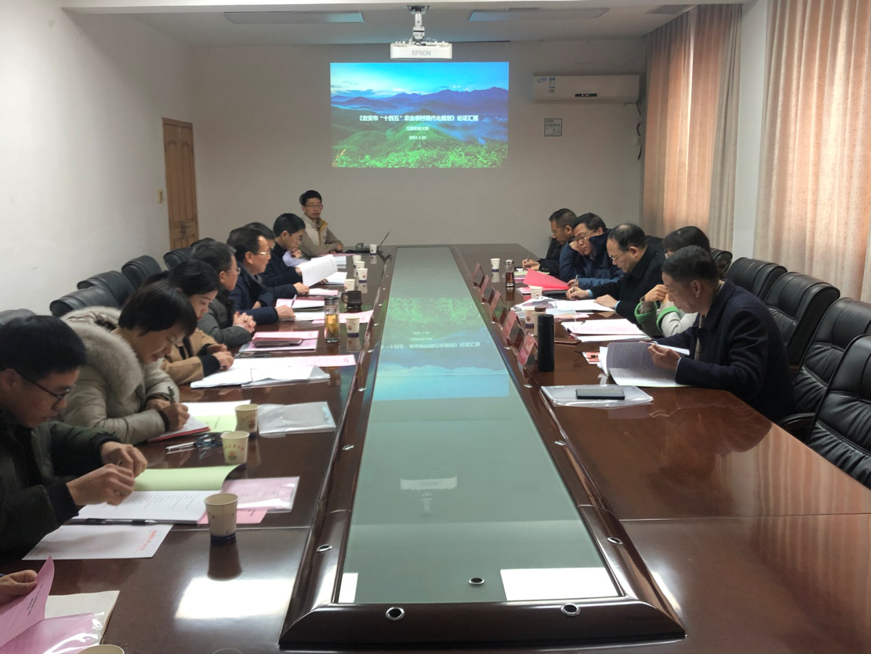 2022年1月22日上午,由经济管理学院承担的《吉安“十四五”农业农村现代化规划》论证评审会暨科研服务交流会,在学校行政办公楼314会议室顺利召开。来自省农业农村厅、省农业技术推广中心、省农业科学院、江西省金穗现代农业咨询有限公司等单位的5位专家对课题进行评审验收。副校长黄英金出席会议并讲话,吉安市农业农村局、校科技处、经管学院相关负责人参加会议。