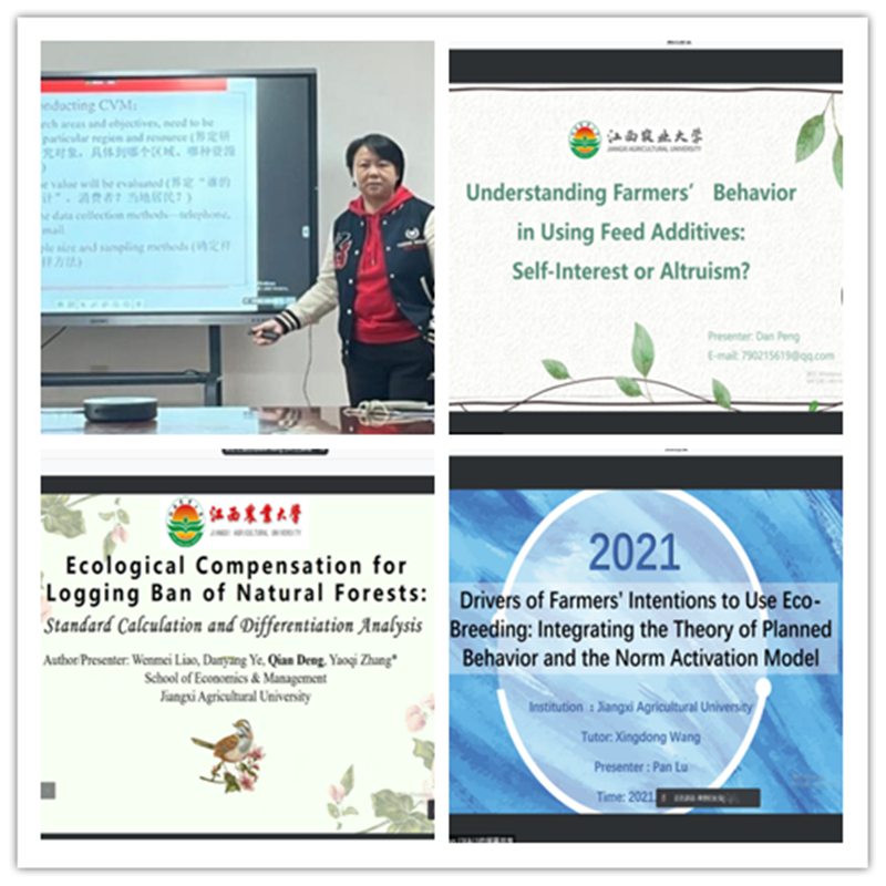 在分论坛二,江西农业大学肖智华博士、博士生邓倩、硕士生彭丹和鲁盼分别以“Evaluation Methodology for Natural and Environmental Resources”、“Ecological Compensation for Logging Ban of Natural Forests: Standard Calculation and Differentiation Analysis”、“Understanding Farmers’ Behavior in Using Feed Additives: Self-Interest or Altruism?”、 “Drivers of Farmers’ Intentions to Use Eco-Breeding: Integrating the Theory of Planned Behavior and the Norm Activation Model”为题进行了论文汇报,评论人江西财经大学周谷珍博士与江西农业大学肖智华博士对汇报论文进行了非常细致地点评。