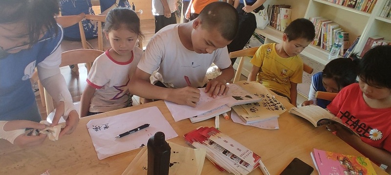 图12 队员们手把手教留守儿童写毛笔字