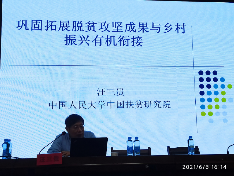汪三贵教授以“巩固拓展脱贫攻坚成果与乡村振兴有机衔接”为题,他梳理了脱贫攻坚与乡村振兴的逻辑关系,分析了脱贫攻坚的成效与原因,分享了巩固拓展脱贫攻坚成果的思路,并从产业发展、生态宜居、教育保障、医疗保障、体制机制、基层治理等6方面重点阐述了促进脱贫攻坚与乡村振兴有效衔接的举措。