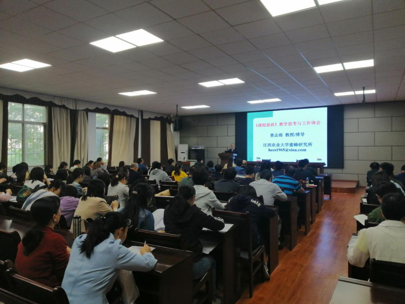 曾志将教授首先以《养蜂学》课程为例,分别从东方蜜蜂特性分析中融入中国人勤劳、勇敢、节俭等传统美德,从蜜蜂作用分析中融入习近平总书记“两山理论”、“精准扶贫”等重要理念,从蜜蜂团队合作中融入政治意识、大局意识、核心意识和看齐意识。接着,他分享了自己1987年大学毕业来学校后是如何在无教学蜂场、无实验室、无团队的“三无”情况下,守初心、担使命、开新局的工作经历和切身体会,并对教师们提出三点希望:一是要有稳定的研究方向,制定好中长期研究计划,不断拓宽自己的知识面;二是要有攻坚克难的毅力恒心,组建齐心协力的研究团队;三是要有对平台对学校的感恩之心,发扬好主人翁精神。