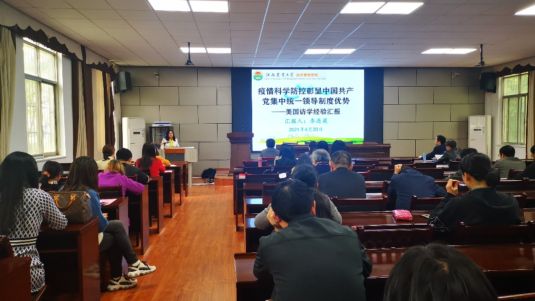 李老师汇报了自己在美国路易斯安那州立大学访学一年的有关情况,从学校、疫情、生活、教学和科研五个方面与大家分享了出国访学的收获与体会,并建议老师们出国访学要尽早规划、未雨绸缪。最后,她表示将把自己学到的知识运用到今后的教学和科研工作中,以感谢党和国家、感谢母校和学院的悉心栽培。