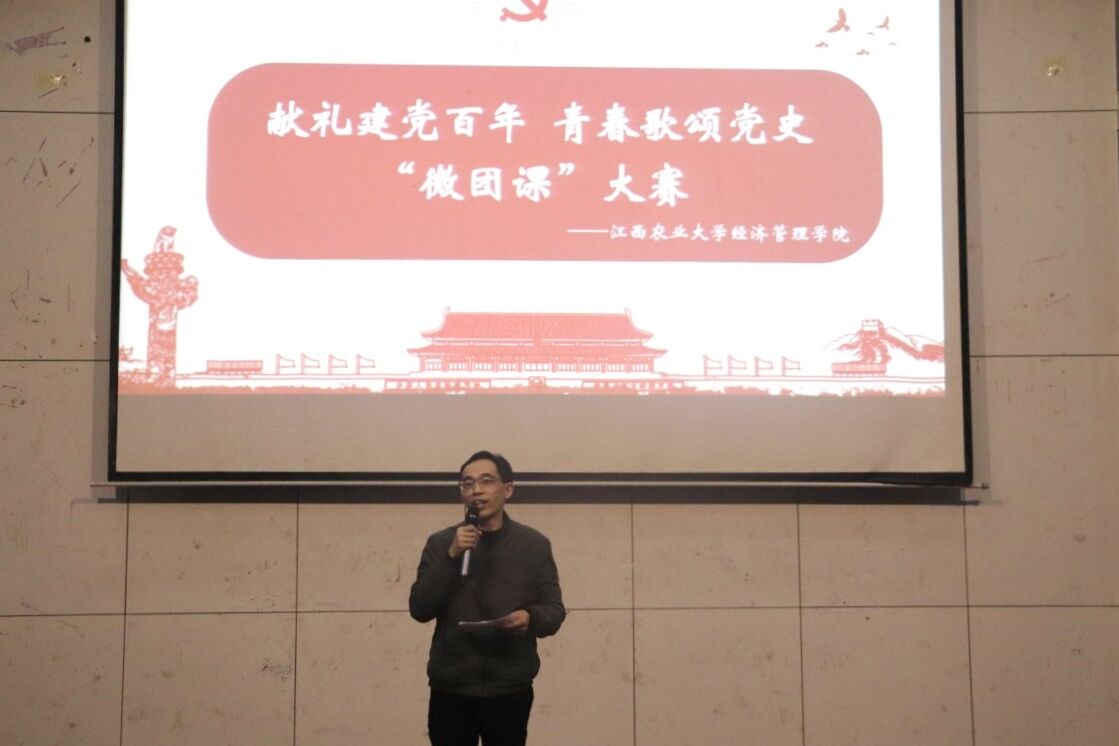 庆祝中国共产党成立一百周年,深入学习贯彻习近平总书记关于青年工作的重要思想,经管学院于4月20日举办第四届“微团课”大赛。此次比赛特邀请软件院团委书记杨玲玲,理学院团委书记彭玉萌,食品院团委书记黄月胜作为评委。学院党委副书记肖明级各位学工办老师以嘉宾身份出席。