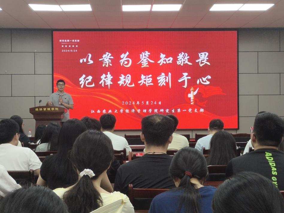 为进一步推进党纪学习教育走深走实,切实加强党员的纪律规矩意识。5月24日下午,经济管理学院研究生第一党支部组织支部党员以及入党积极分子开展“以案为鉴知敬畏 纪律规矩刻于心”的党纪学习教育主题党日活动。