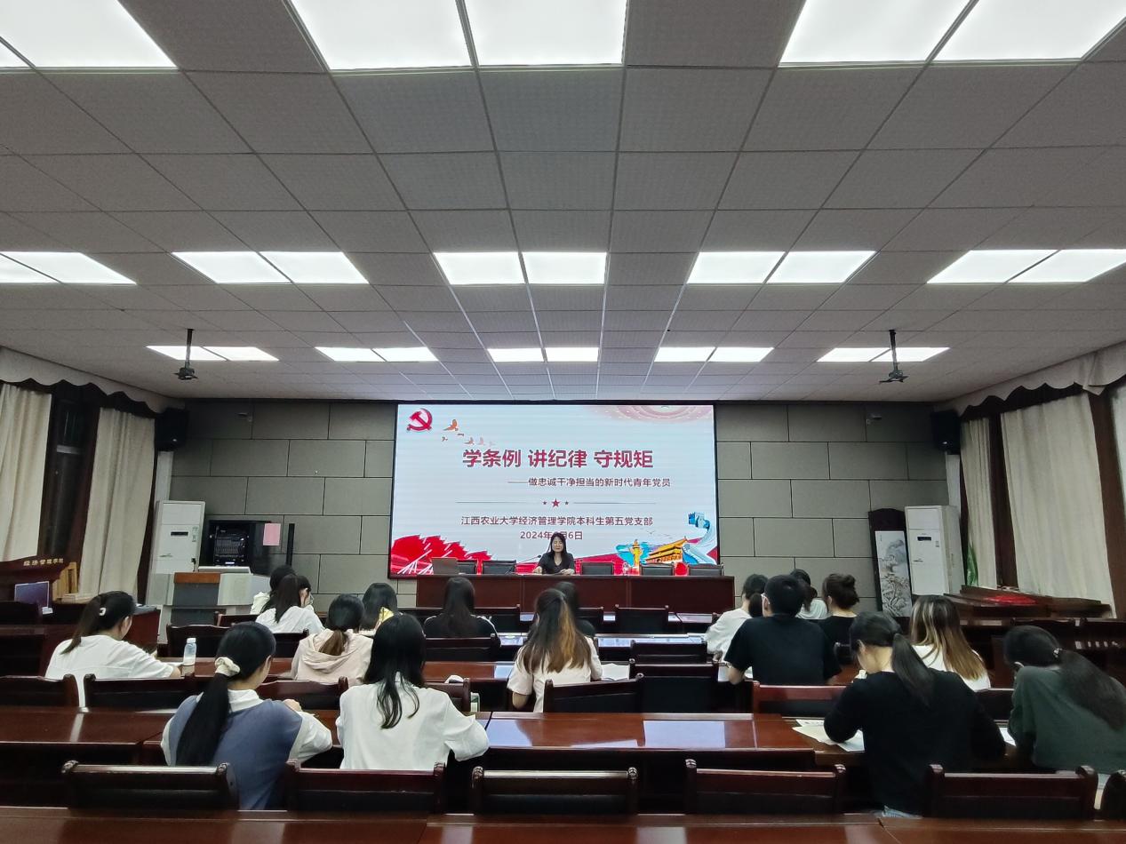 为进一步推进党纪学习教育走深走实,6月7日,经管学院本科生第五党支部于在经世楼207开展“学条例 讲纪律 守规矩 ——做忠诚干净担当的新时代青年党员”主题纪律党课。此次党课由党支部书记李子琳主讲,本科生第五党支部全体党员参加。