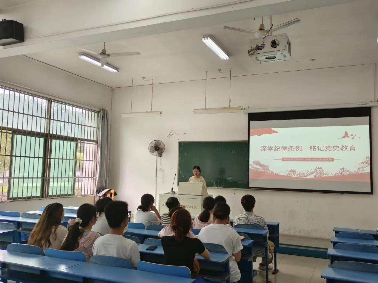 为进一步学习贯彻《中国共产党纪律处分条例》,增强支部党员的纪律意识和规矩意识,经济管理学院本科生第四支部于2024年6月12日在e教109教室隆重举行了以“深学纪律条例,铭记党史教育”为主题的党日活动。