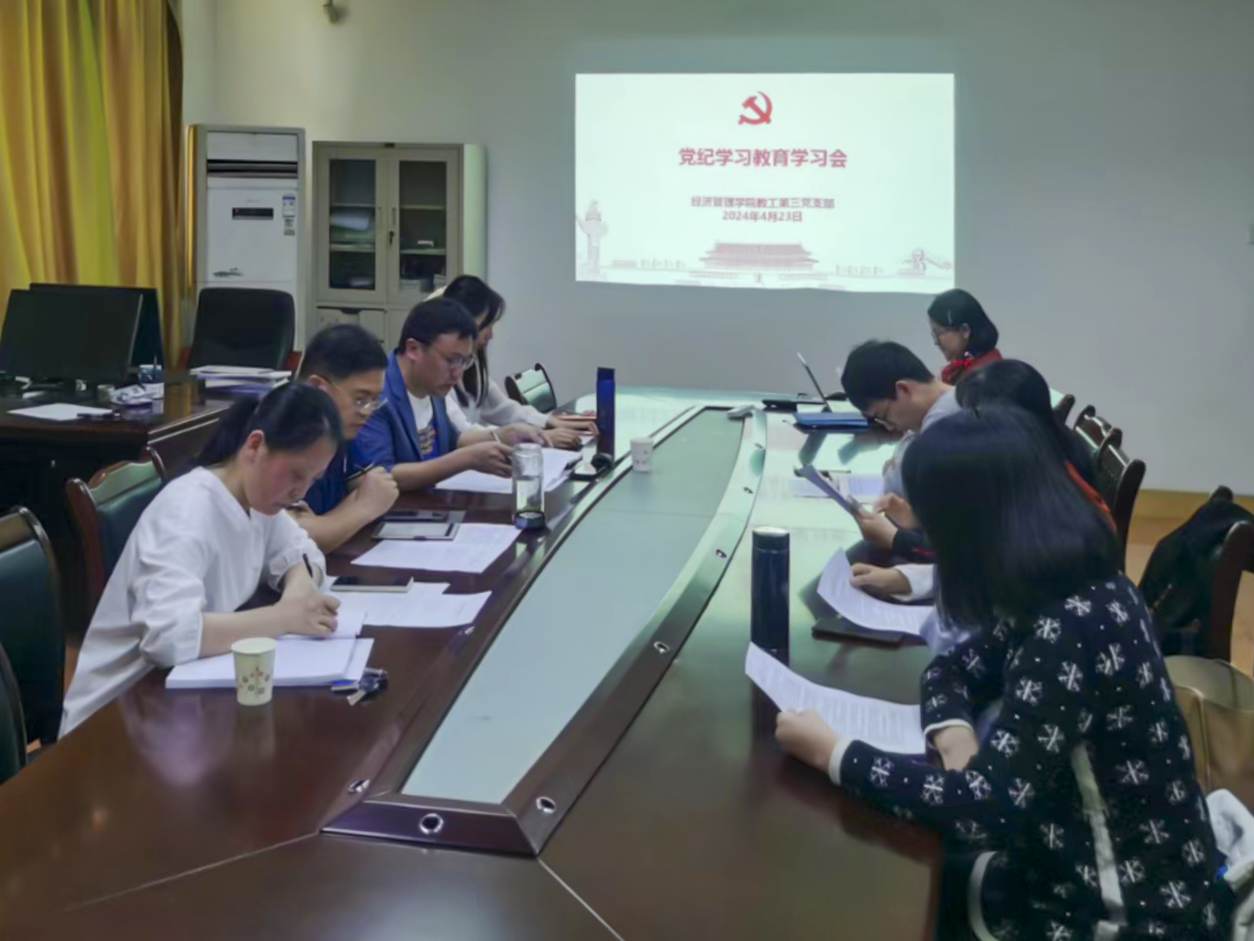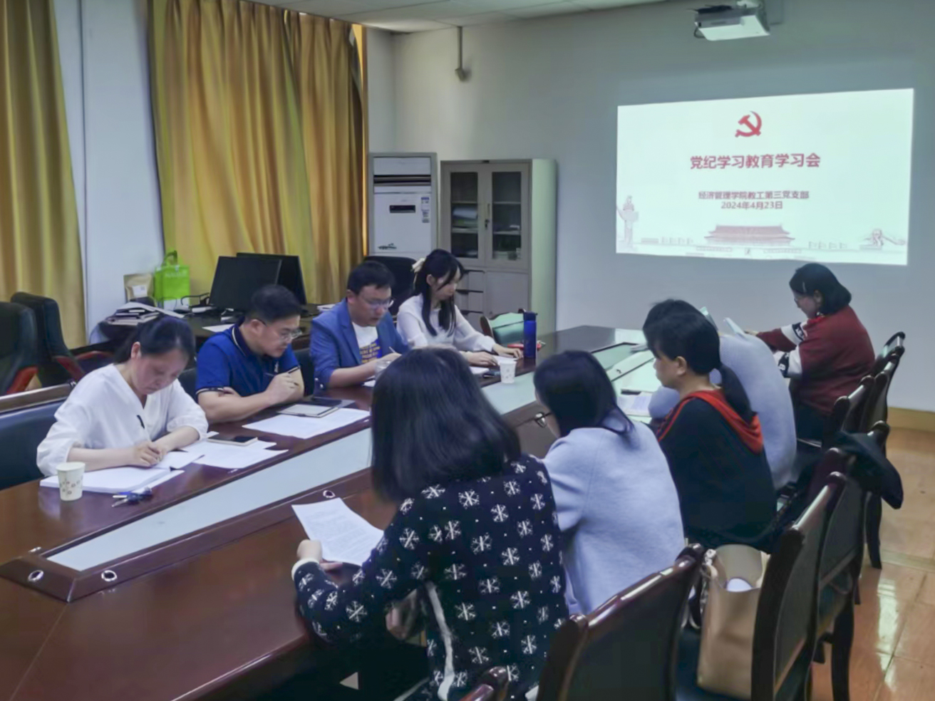 为高质量落实党纪学习教育,加强经管学院教工第三党支部的党纪建设,4月23日下午,教工第三党支部召开了主题为“学纪,知纪,明纪,守纪”的党纪学习教育学习会暨党员大会。院党委书记、支部党员熊龙彪到会指导,会议由教工第三党支部副书记徐冬梅主持。