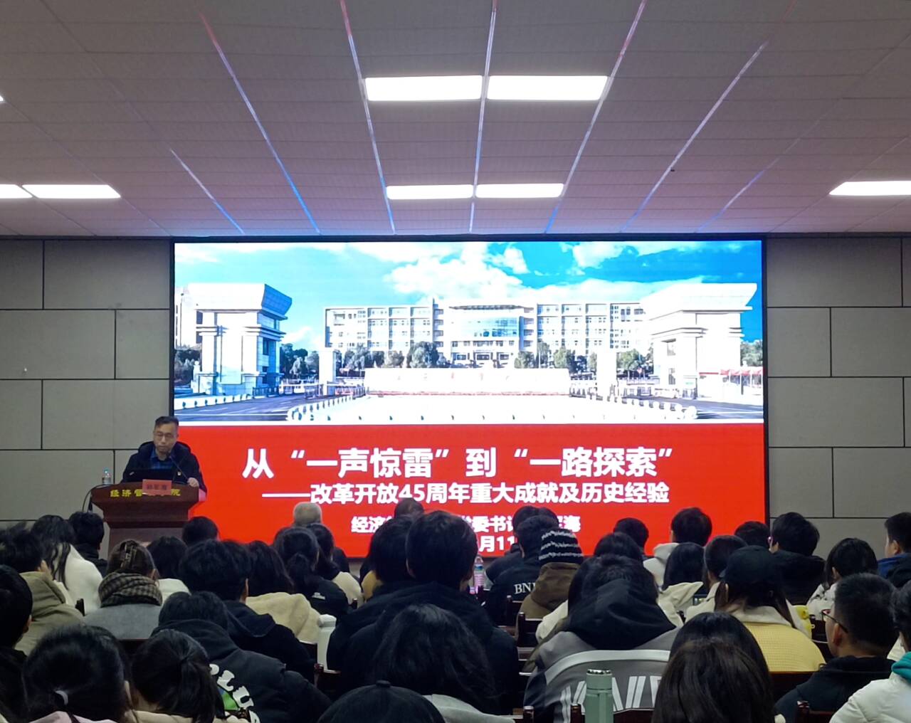 “我们的家乡,在希望的田野上,炊烟在新建的住房上飘荡,小河在美丽的村庄旁流淌......”,党课在欢快活泼的《在希望的田野上》拉开序幕。学院党委书记郭军海围绕改革开放的唤醒起点、历史进程、辉煌成就、经验启示、时代新程五个部分深入阐释了改革开放45周年重大成就及进入新时代内涵不断丰富的历史进程,结合学院“六个经管”建设落实情况进行了阐述。他强调,唯有开拓进取、齐头并进,才能够披荆斩棘,不断创造美好未来,希望经管学院学子接续奋斗,大力弘扬改革开放精神,争做有理想、敢担当、能吃苦、肯奋斗的新时代好青年。