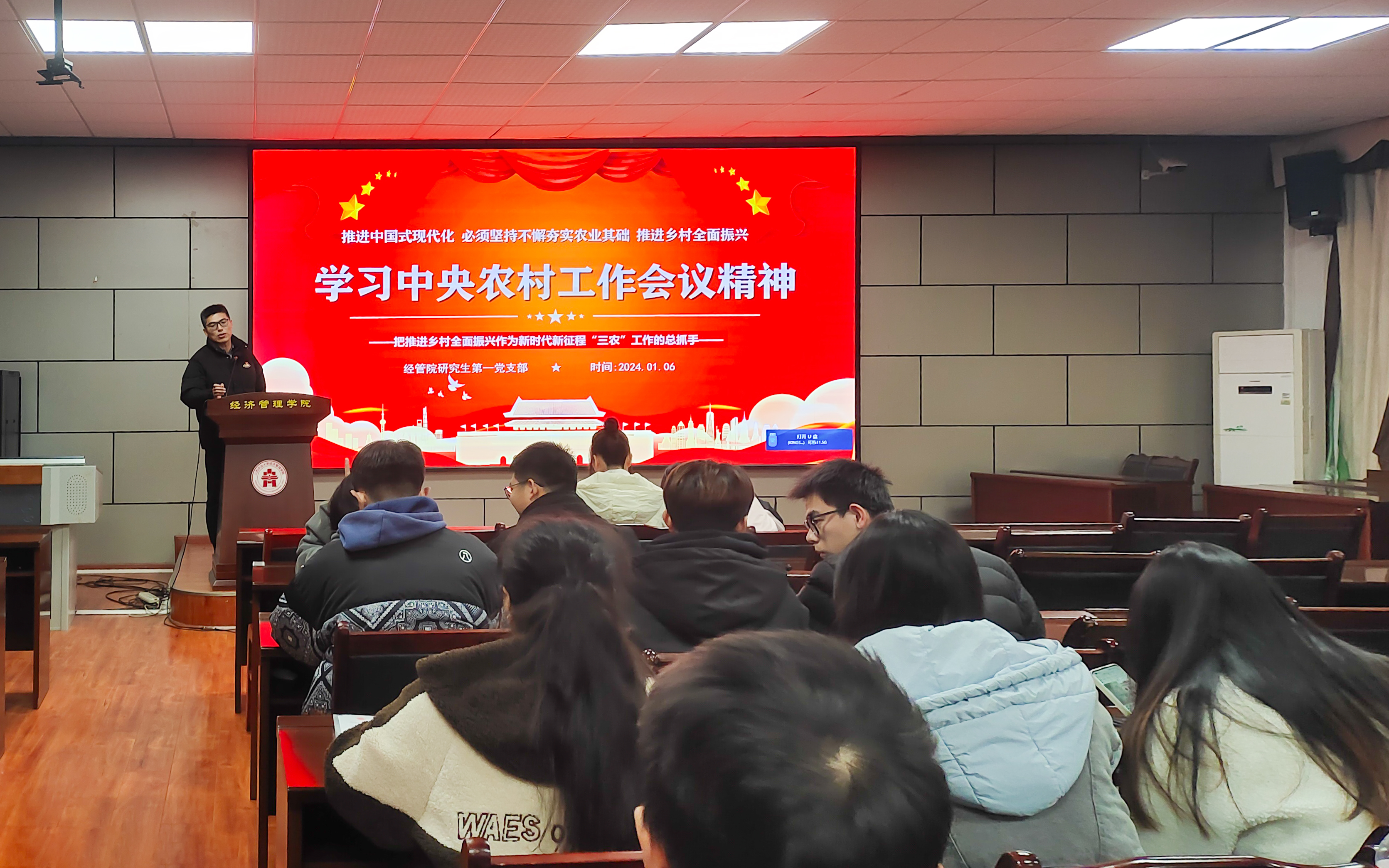 为深入学习2023年中央农村工作会议精神及领会习近平总书记对“三农”工作做出的重要指示,1月6日下午,研究生第一党支部开展以“学习中央农村工作会议精神”为主题的党日活动。研究生第一支部书记李秋生主持活动,支部全体党员参与。