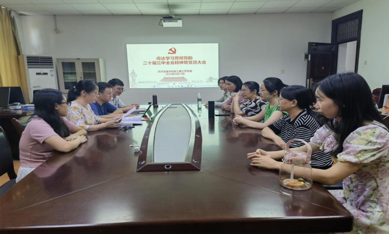 为进一步学习贯彻党的二十届三中全会精神,9月10日,经管学院教工第三党支部开展“传达学习贯彻党的二十届三中全会精神大会”主题学习会,会议由支部书记刘小春主持。