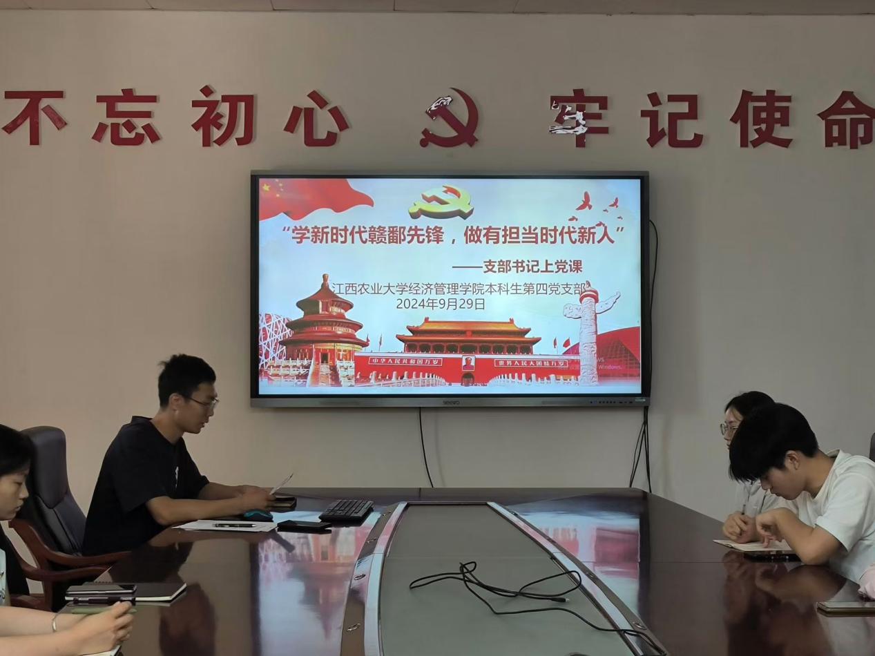 为深入贯彻落实2024年度“新时代赣鄱先锋”学习宣传暨“新时代赣鄱先锋”创绩提升行动的有关要求,以“新时代赣鄱先锋”为榜样,激励支部党员发挥先锋模范作用,经管学院本科生第四党支部全体党员于9月29日在经世楼204会议室召开了以“学新时代赣鄱先锋,做有担当时代新人”为主题的党支部书记讲党课活动。