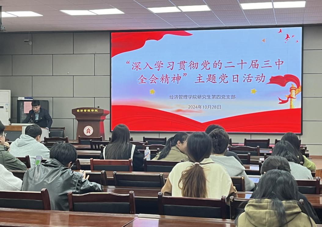 10月28日,经管学院研究生第四党支部在经世楼207会议室召开了“深入学习贯彻党的二十届三中全会精神”为主题的党日活动,会议由支部书记廖冰主持,支部全体党员参与。