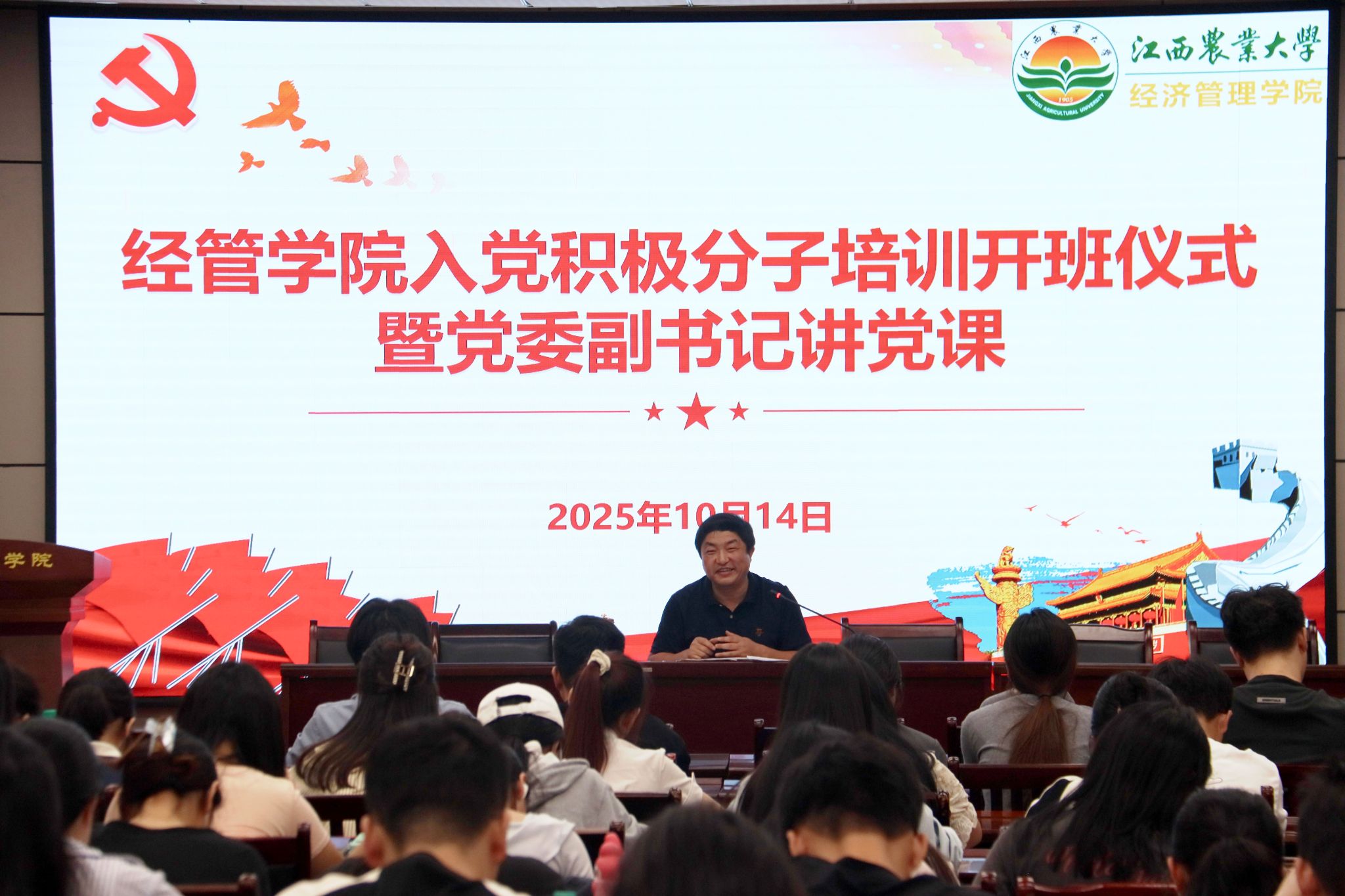 10月14日下午,经管学院在经世楼207教室举行2025下半年入党积极分子培训班开班仪式。学院党委副书记罗志华、副科级组织员李子琳及新确定入党积极分子、发展对象全体人员参加会议。
