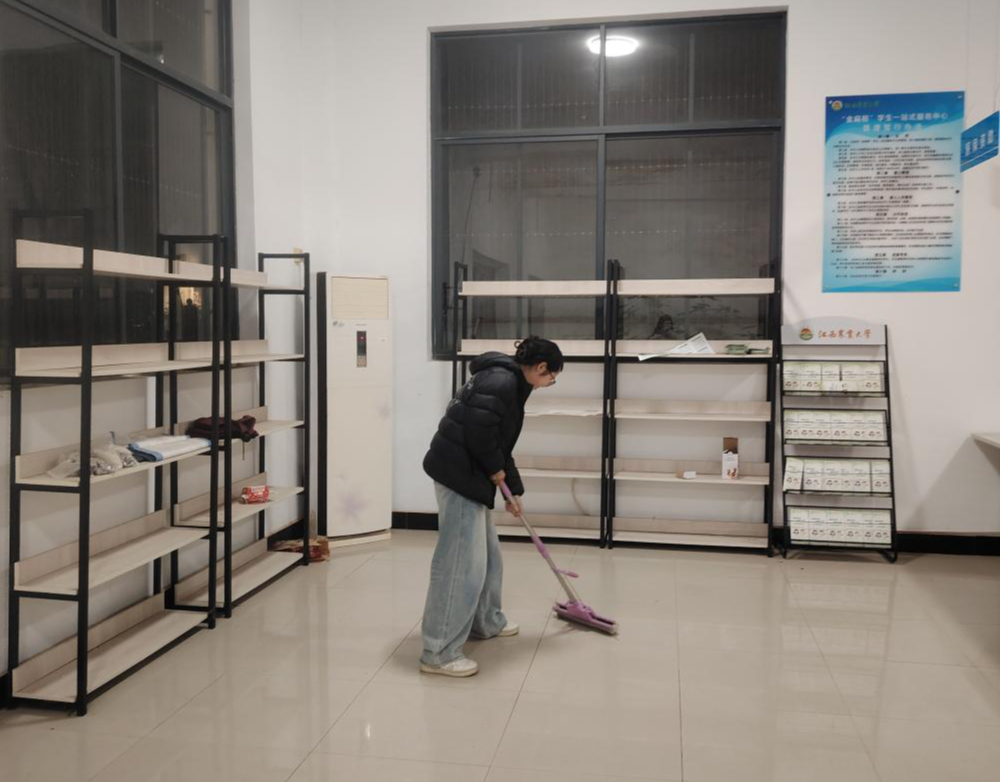 同时,党员们承担起服务点的卫生工作。每日值守前后,大家都会对服务台及周边区域进行擦拭清扫,及时清理垃圾杂物,用细致的行动为同学们营造出整洁舒适的办事环境。从解答疑问到维护环境,党员们以“小事做实、实事做细”的作风,诠释了“一名党员一面旗帜”的担当,也让“为同学办实事”的理念融入日常。