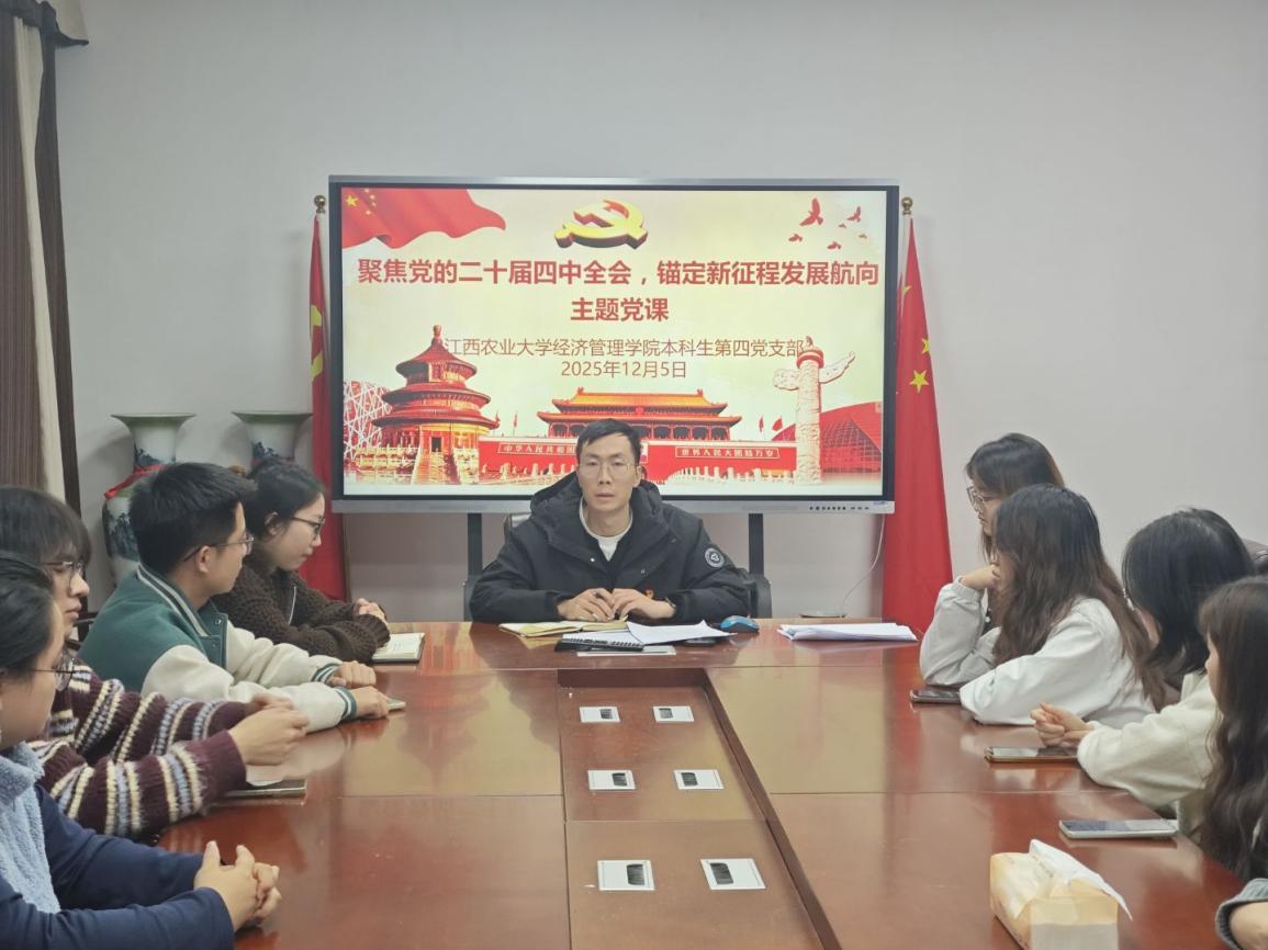 为了学习贯彻党的二十届四中全会精神,进一步增强新时代青年党员的使命感和方向感,经管学院本科生第四党支部于2025年12月5日在经世楼212会议室组织召开“聚焦党的二十届四中全会,锚定新征程发展航向”主题党课。