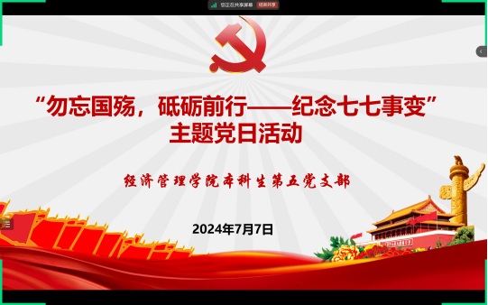 为深切缅怀先烈,传承伟大民族精神,7月7日,本科生第五党支部线上开展主题为“勿忘国殇,砥砺前行——纪念七七事变”党日活动。经管院本科生第五党支部全体党员及部分积极分子参与此次活动。