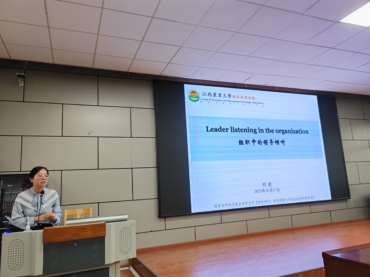 10月18日下午,刘庚博士为我院师生作以“组织中的领导倾听”为题的学术报告,报告由学院科研秘书陈江华博士主持,廖文梅教授、汪兴东教授等60余名师生参加了学术报告。