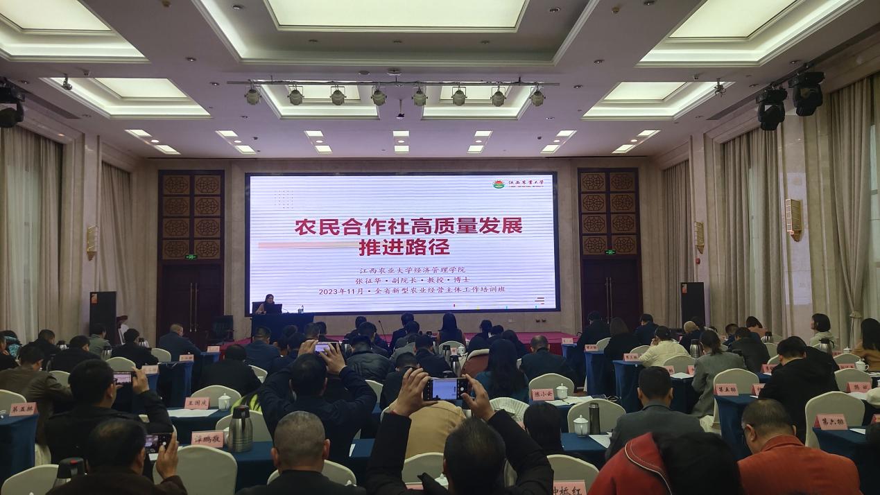 11月30日,由江西省农业农村厅农村合作经济指导处举办的全省新型农业经营主体工作培训班在南昌市京西宾馆举行。经管学院副院长张征华教授应邀作《农民合作社高质量发展推进路径》报告。合作经济指导处郑远䘵副处长主持,李上海处长等出席了培训会议。江西省各市、县(市、区)农业农村部门近200名农经工作人员参加本次培训。