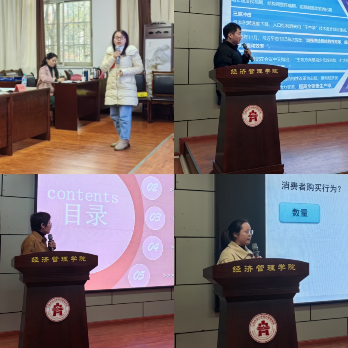 12月12日下午3点,经管学院在经世楼207报告厅举行了2023年金牌讲师教学竞赛。华东交通大学蒋翠珍教授、东华理工大学罗志红教授、江西农业大学农学院向妙莲教授以及人事处黄维柳处长应邀担任评委。此次竞赛由副院长张征华教授主持,众多师生代表到场观摩。