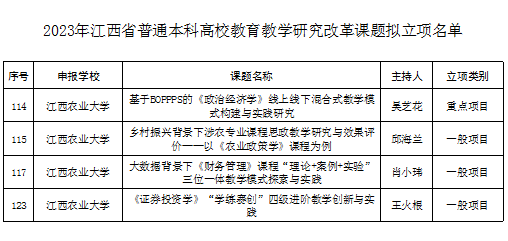 近日,江西省教育厅公布了《2023年江西省普通本科高校教育教学研究改革课题拟立项名单》,经管学院4名教师申报的课题成功获批立项,其中重点项目1项。