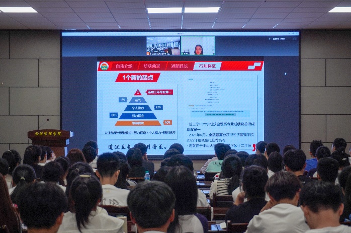 来自金融2101班的老生代表胡梦婷同学也向本届新生分享了自己两年学习的心得,希望新同学们在大学里不要随波逐流,与其徒增焦虑,不如走好眼前的每一步,在没有明确的目标前认清并接纳自己的迷茫,保持求知的热忱,树立主动学习的观念。强调主动学习的重要性后,胡梦婷分享了自己的学习经验,推荐新同学们养成记笔记的习惯,形成自己的知识框架,专业学习的同时提高英语素养,辅以网课学习,通过各类赛事进行输出,形成学习循环。