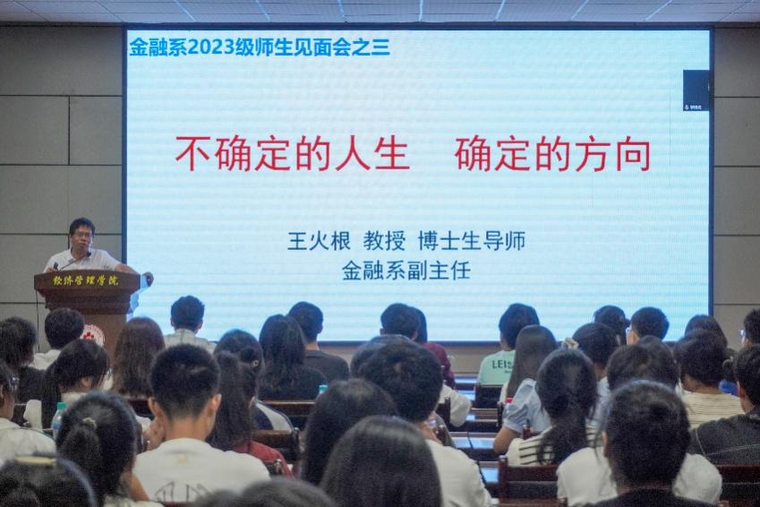 为了给2023级金融学专业新生系好第一粒扣子,尽早树立专业思想,增进金融系师生之间的凝聚力,架起师生之间的沟通桥梁,使新同学们对系情有更好的了解与认识。经管学院金融系于2023年9月12日下午在经世楼207举行了“最美的相遇”——经管学院2023级金融学专业师生见面会。学院副院长周波、金融系全体教师、新生班主任、辅导员及2023级新生参加了大会。会议由金融2003班李婧暄同学主持。