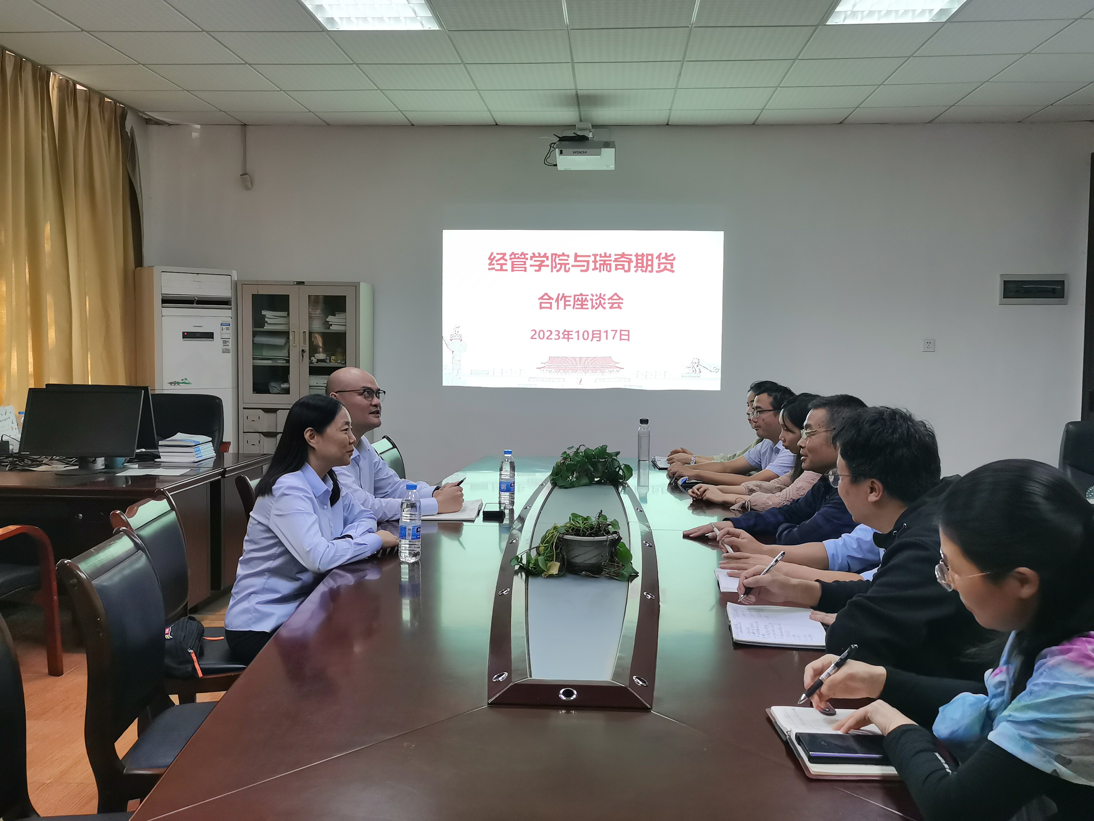 为进一步加强校企合作,助力新文科背景下校企协同育人走深走实。10月17日下午,应经管学院金融系邀请,江西瑞奇期货有限公司副总经理蔡恒跻、投教部经理芦迎晟来访我院并进行合作座谈,经管学院院长翁贞林教授及金融系“保险+期货”师资团队教师参加会议。会议由刘小春老师主持。